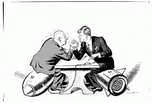 Khrushchev and Kennedy arm-wrestling over nuclear missiles
